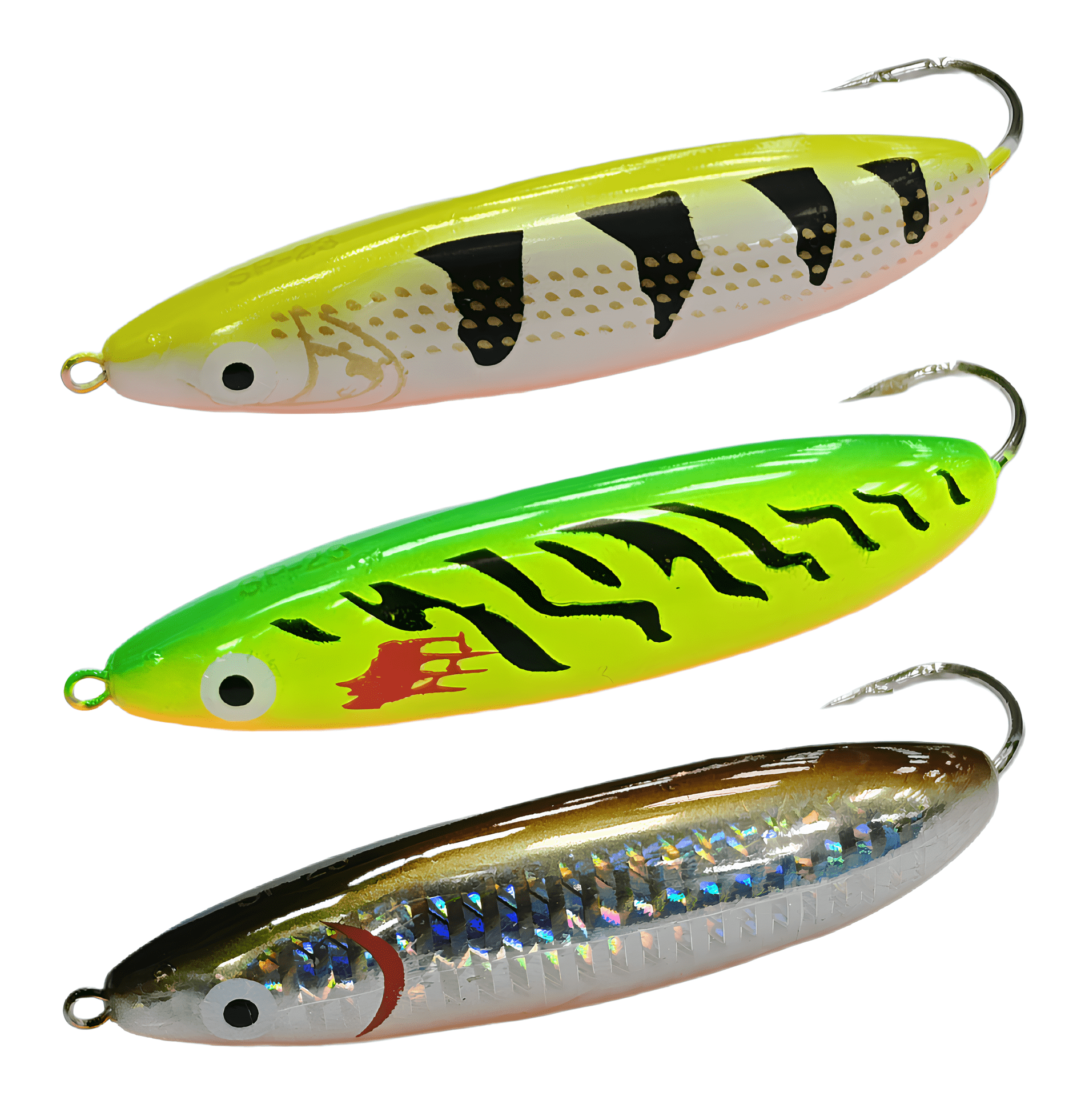 •  Узкие. Коэффициент отношения длины к ширине — более 3,5. Узкие «колебалки» идеально подходят для ловли на течении и при быстрой проводке. Они не срываются во вращение при быстрой проводке, и их колебательные движения достаточно размашисты. Однако активность и амплитуда колебаний сильно зависят от скорости и вида проводки. Угол отклонения задней части приманки может достигать 45 градусов и выше. Часто можно услышать обобщённое название таких узких и вытянутых блесен — «Ивовый лист».