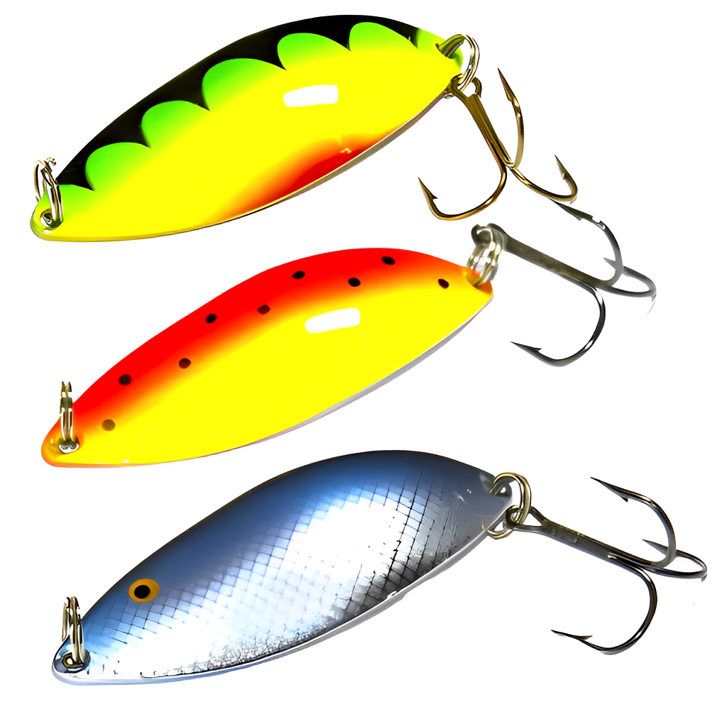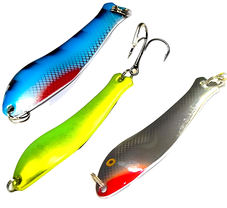 •  Узкие. Коэффициент отношения длины к ширине — более 3,5. Узкие «колебалки» идеально подходят для ловли на течении и при быстрой проводке. Они не срываются во вращение при быстрой проводке, и их колебательные движения достаточно размашисты. Однако активность и амплитуда колебаний сильно зависят от скорости и вида проводки. Угол отклонения задней части приманки может достигать 45 градусов и выше. Часто можно услышать обобщённое название таких узких и вытянутых блесен — «Ивовый лист».