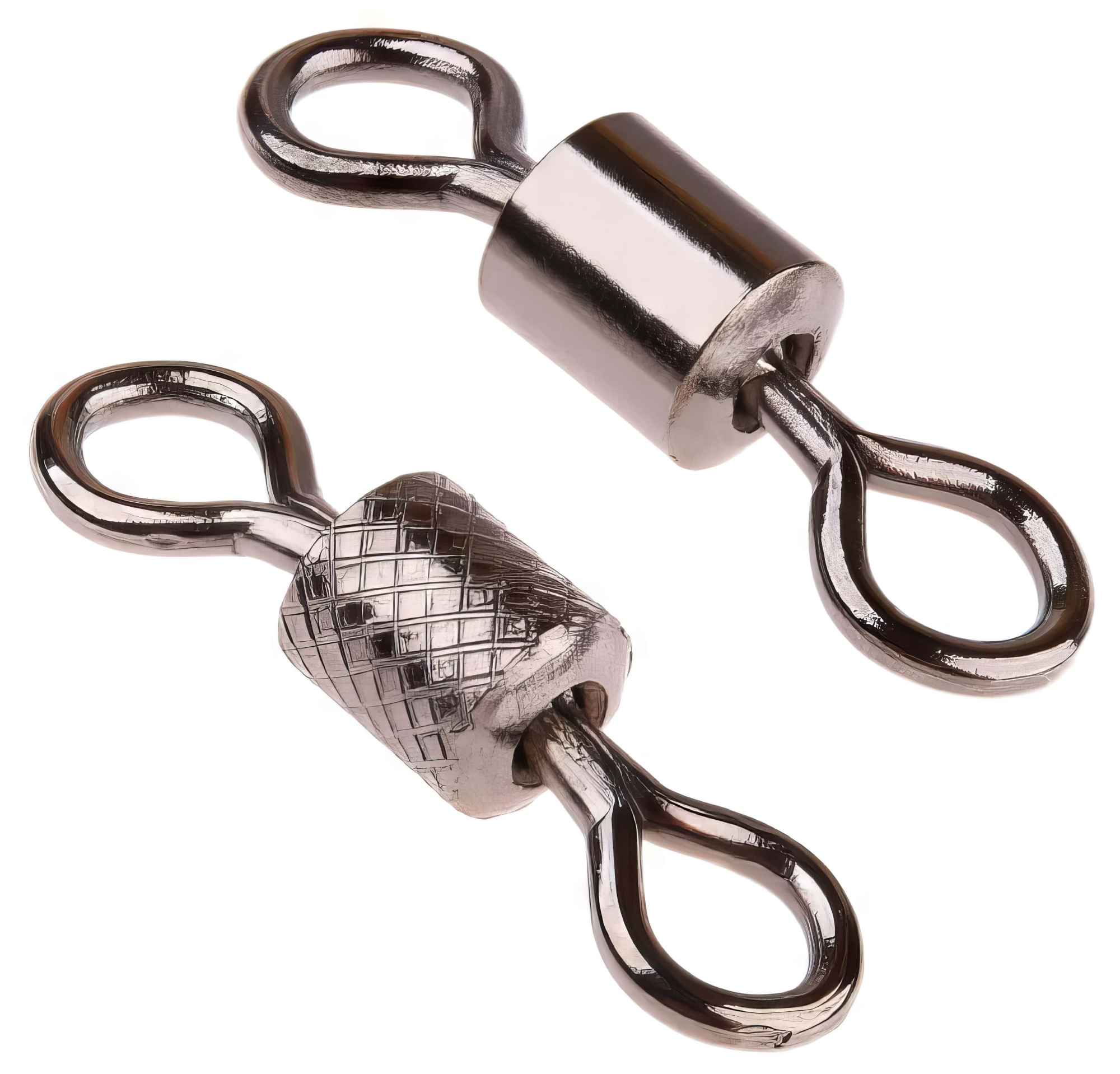 Для предотвращения таких проблем используется такой элемент фурнитуры, как вертлюжок. Он представляет собой две проволочные петельки с расплющенными концами, которые закатываются в металлический шарик или бочонок.